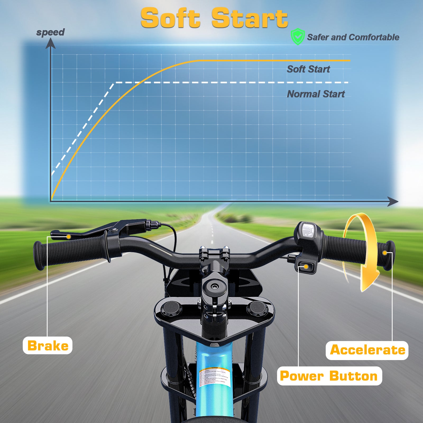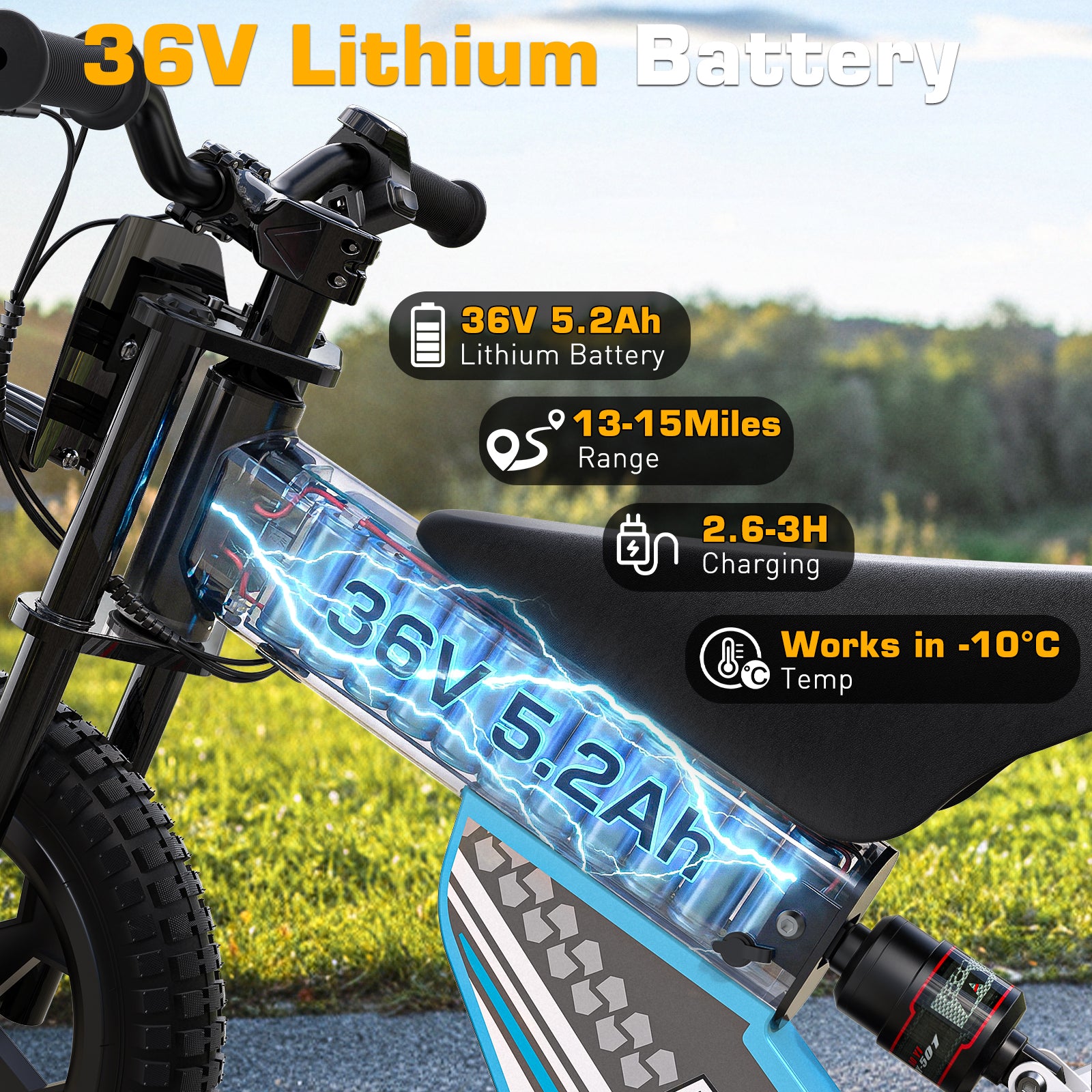 Reliable 200W Power: Perfectly tuned for younger riders, the 200W motor provides smooth and stable power, making it an ideal entry-level dirt bike for kids.